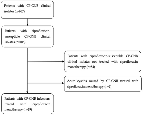 During the study period, 637 patients with CP-GNB clinical isolates were identified. Of these patients, 105 (16.5%) had isolates susceptible to ciprofloxacin; ultimately, 19 met the study inclusion criteria (Figure 1).