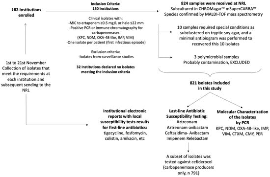 A schematic representation of the workflow, number of isolates, and tests performed is shown in Figure 1.
