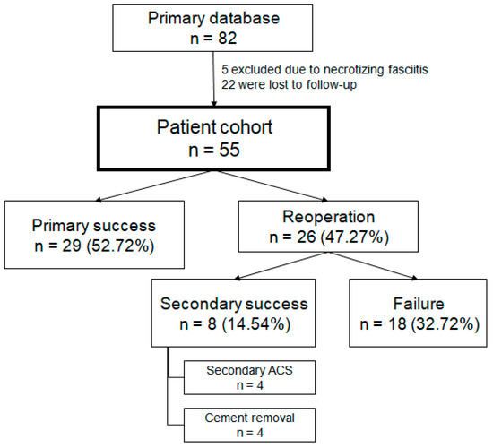 Flow diagram presenting patient cohort with preliminary outcomes. n, number of patients; ACS, debridement with implantation of antibiotic-impregnated cement-spacer.