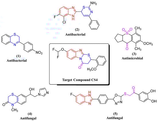 Heterocyclic compounds exhibit substantial biological potential and serve as the nexus between chemistry and biology. Over 90% of novel medications have heterocyclic themes [5,6]. Sulfur-and-nitrogen-containing heterocyclic compounds such as thiazole [7], thienopyrimidine [8], thiomorpholine [9], thiazine and benzothiazines heterocycles exhibit distinct properties as biologically active agents and have captivated researchers for many years due to their historical significance in the field of organic synthesis [10]. Recently, thiazine has captured the interest of scientists as a significant structural motif in medicinal chemistry [11]. It is composed of sulfur (S) and nitrogen (N) atoms with four carbon atoms arranged in a six-membered ring and is categorized into three groups depending on the positions of the N and S atoms in the ring: 1,2-thiazine, 1,3-thiazine, and 1,4-thiazine [12]. Moreover, benzimidazole is described as a fused bicyclic heteroaromatic compound, composed of a benzene ring and imidazole ring. The presence of a nitrogen atom makes the benzimidazole ring more electron-rich, explaining why it can donate or accept electrons and also easily form weak interactions with different biological targets [13]. Both motifs have garnered significant attention due to their promising therapeutic potential, serving as antibacterial, antifungal, anti-inflammatory, antiviral, anticancer, anticonvulsant, antihistamine, and antidepressant agents [14,15].