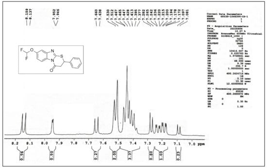 The structures of newly synthesized compounds were confirmed utilizing various spectroscopic techniques, such as FT-IR, 1D NMR (1H, 13C, DEPT experiments), 2D NMR (HMQC), and mass spectrometry. All the data were found to accord with the proposed structure. In the IR spectra of new benzimidazole–thiazinone derivatives, strong absorption peaks due to stretching vibrations appeared at 3048–3084 cm−1 (sp2 C-H), 2903–2970 cm−1 (sp3 C-H) and 1678–1718 cm−1 (C = O). The 1H NMR spectra of all of the synthesized compounds exhibited signals for the protons of the vicinal CH2 (two multiplet in the range of 3.19–3.88 ppm) and CH (multiplet around 5.34–5.45 ppm) groups. The signals with aromatic protons appeared in the expected region (6.5–8.0 ppm). In 13C NMR of these compounds, characteristic signals for carbonyl carbon appeared at 167.1–172.5 ppm and for aliphatic carbon (CH and CH2) in the 41.00–43.00 ppm range. Further, a full assignment of the 1H NMR peaks for compound CS1 is provided in Figure 2 and Figure 3. In Figure 2, a doublet peak at 8.15 ppm with a J value of 8.8 Hz might belong to the proton of the benzimidazole ring which was ortho coupled with an adjacent proton. The doublet peak at 7.95 ppm with a J value 2.4 Hz was also found to correspond with the proton of the benzimidazole ring, demonstrating meta coupling. Furthermore, the presence of a doublet signal at 7.53 with a coupling constant of 7.2 Hz might be related to two ortho protons of the benzene ring. A multiplet peak, appearing at 7.46–7.37 ppm, was also found to correspond with three protons of the benzene ring at meta and para positions. Another signal with a doublet (J = 6.8 Hz) appeared at 7.28 ppm for one proton of the benzimidazole ring, followed by a set of doublets with a small coupling constant in a unique environment, possibly corresponding with the proton of the difluorometoxy (CHF2) group at 7.22–7.17 ppm δ value. Further, Figure 3 shows the proton peaks in the aliphatic region. A peak, appearing at 5.44 ppm in multiplet, was found to belong to the proton of the methine (CH) group. Other multiplet signals, at 3.88–3.80 ppm and 3.43–3.37 ppm, were found to correspond with the protons of the methylene (CH2) groups. The chemical environment of these methylene protons was slightly different and so appeared at different δ values. Peaks at 3.32 ppm and 2.50 ppm were found to belong to H2O and DMSO-d6, respectively. An additional study, Distortionless Enhancement of Polarization Transfer (DEPT)-135, confirmed the presence of secondary carbon by showing a negative peak at 41.30 ppm. (Figure S1) Further, in a 2D heteronuclear multiple quantum coherence (HMQC) NMR spectrum, the carbon–proton relationship showed that the protons at 3.82 ppm and 3.43 ppm were directly attached to the same carbon atom at 41.18 ppm and the proton at 5.42 ppm was found to be attached to the carbon at 42.80 ppm. (Figure S2) The mass spectra of all of the compounds matched with calculated values, displaying [M + H] and [M + S] peaks. All of these spectral studies have confirmed the structure of the final compounds. Further, each final compound was verified to have a purity of ≥90% before conducting any biological assays.
