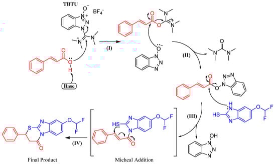 The detailed protocol for the synthesis of derivatives (CS1–CS10) is given in Scheme 1. Substituted benzimidazole–thiazinone derivatives were synthesized via a single-step multicomponent system utilizing TBTU at room temperature. A hypothetical mechanism of reaction [20] is given in Scheme 2. A coupling reaction was performed between (difluoromethoxy)-1H-benzo[d]imidazole-2-thiol C1 and different substituted trans acrylic acids C2 in the presence of coupling reagent TBTU and base N,N-diisopropylethylamine (DIPEA) using dry N,N-dimethylformamide (DMF) as a solvent. In the first step, TBTU facilitated the formation of an O-acylisourea intermediate followed by the formation of an active ester with the coupling reagent attached in the second step. In the third step, nucleophilic attack detached the benzotriazole group to generate the supposed intermediate, (E)-1-(5-(difluoromethoxy)-2-mercapto-1H-benzo[d]imidazol-1-yl)-3-phenylprop-2-en-1-one. Then, in the fourth step, the intermediate was cyclized via Michael addition reaction between the sulfur of the benzimidazole ring and the α,β-unsaturated carbonyl bond to produce a tricyclic benzimidazole–thiazinone derivative as the final product.
