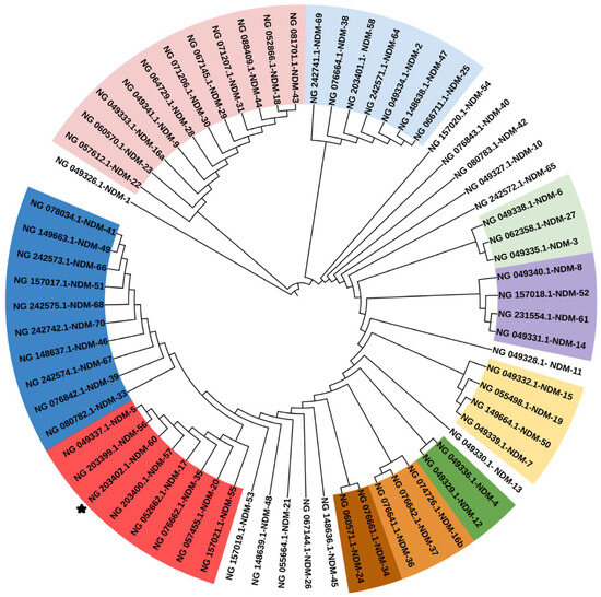 Phylogenetic analysis of blaNDM alleles. The circular dendrogram depicts the evolutionary relationships among different NDM gene alleles, with each branch representing a distinct allele. NDM-60 is included in the red-colored cluster and marked with a star.