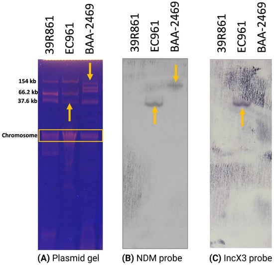 Gel electrophoresis and Southern blot analysis of plasmid profiles from E. coli strains EC961 (harboring NDM-60) and BAA-2469 (harboring NDM-1). Plasmid gel image (A) shows the results of agarose gel electrophoresis, displaying plasmid profiles for each isolate, with band sizes indicated. E. coli strain 39R861 was used as a size marker control (A). (B,C) Southern blots of the same gel, hybridized with a probe specific for NDM gene (B), then hybridized with a probe specific to the IncX3 plasmid replicon (C) to localize the IncX3-bearing plasmid. Yellow arrows highlight bands where successful hybridization occurred, confirming the presence of NDM-carrying plasmids at anticipated sizes in the analyzed strains and confirming that the same plasmid in EC961 carried the IncX3 plasmid replicon. BAA-2469 is lacking IncX3 based on ATCC records; thus, it was used as a negative control in plasmid replicon experiment (C), while it worked as a positive control for the NDM gene (B).