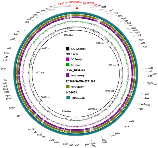 We performed comparative genomic analysis of all known NDM-60-containing strains. Notably, the NDM-60 gene was reported once by a research team from the National Institute for Public Health and the Environment in the Netherlands in July 2023. The gene was identified in Escherichia coli strain RIVM_C055236, which was found to have the subclass B1 metallo-beta-lactamase NDM-60 gene according to the NCBI database (GenBank accession number: OR139852.1) [20]. The whole-genome sequence of this strain was retrieved from the EnteroBase database (https://enterobase.warwick.ac.uk/species/index/ecoli, accessed on 2 August 2024), which is also available from the NCBI (BioSample: SAMN39950546; SRA: SRS20469100; Bio Project: PRJNA1076808). According to the NCBI, the specimen from which the strain was isolated was a swab from 66-year-old male patient hospitalized in the Netherlands [21]. Figure 4 shows the comparative genomics analysis of our strain (EC961) and RIVM_C055236, highlighting the high genetic similarity of the strains.