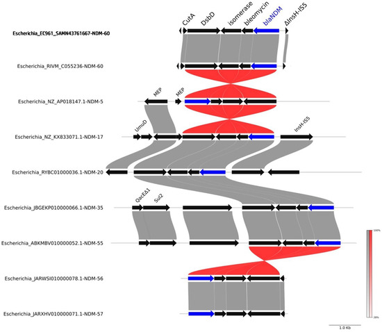 Sequences containing blaNDM alleles were retrieved from publicly available genomic databases (NCBI). The selected sequences included blaNDM alleles from E. coli strains. The sequences were aligned and visualized using pyGenomeViz (https://github.com/moshi4/pyGenomeViz, accessed on 20 October 2024). blaNDM genes and adjacent genes, such as ble (bleomycin resistance gene), isomerase, and reductase, were annotated. Red and gray shading was applied to indicate regions of homology [20].