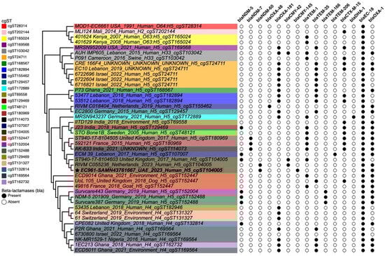 Genomic analysis indicated that our strain (EC961) belongs to sequence type (ST) 940; therefore, we retrieved the whole-genomic sequences of E. coli with the same ST to explore any genetic similarities among clonally related strains. The process involved screening 39,034 E. coli genomes from the GenBank database (https://ncbi.nlm.nih.gov/datasets/genome/?taxon=1, accessed on 20 August 2024). Finally, ST940 was detected in 42 strains, including the strain from the Netherlands (RIVM_C055236). Among the ST940 genomes, 26 have cgMLST profiles, with cgST24711 being the most prevalent (n = 5). Figure 6 shows the core genome SNP-based phylogenetic tree of all 43 E. coli strains belonging to ST940, with their geographic origin, year of isolation, source (human/environment), OH serotype, cgST type, and beta-lactamase genes.
