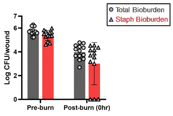 Total and staphylococci commensal bacteria on the commercial porcine skins before and after the burn. The bacterial numbers were transformed into logs and plotted as mean ± standard deviation. n ≥ 12 wounds/group, with a minimum of three biological repeats. Circles and triangles represent the total commensal bacterial number and staphylococci number, respectively.