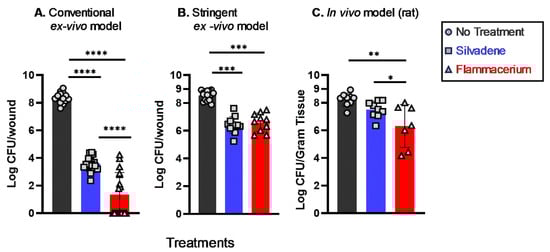 Treatment effects observed in our stringent ex vivo burn wound infection model were comparable to in vivo studies. Treatment outcomes of Silvadene and Flammacerium against P. aeruginosa were compared among the conventional ex vivo burn wound infection model (A), our stringent ex vivo burn wound infection model (B), and an in vivo (rat) model of burn wound infection (C). For both the conventional and stringent ex vivo methods, there were n ≥ 10 wounds per group, with three or more biological replicates, and for the in vivo study, n ≥ 7 rats per group. Significant differences were based on one-way ANOVA analyses followed by Tukey’s multiple comparison post-test. * p < 0.05, ** p < 0.01, *** p < 0.001 and **** p < 0.0001.