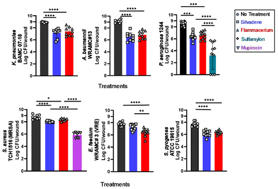 Antimicrobial efficacy of commonly used topical antimicrobial creams against frequently encountered burn wound pathogens. n ≥ 10 wounds/group, with a minimum of three biological repeats. Significant differences were based on one-way ANOVA analyses followed by Tukey’s multiple comparison post-test. * p < 0.05, ** p < 0.01, *** p < 0.001 and **** p < 0.0001. Each bar represents mean ± standard deviation.