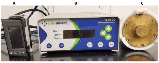 The burn device was designed in our laboratory by Dr. Tao You and built by a local machine shop. The burn device was connected to a pressure gauge DP400S from Omega Engineering (Irlam, Manchester, UK) to monitor the applied pressure and to the Advanced Multiparameter controller TC9500 from Cole Palmer (Vernon Hills, IL, USA), to control the temperature of the burn block (Figure 5).