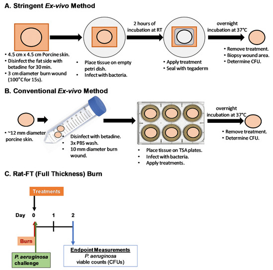 Schematic diagrams of different experimental designs used in this study, (A) Stringent ex vivo, (B) Conventional ex vivo, and (C) Rat-FT (Full-thickness) burn wound model using Silvadene and Flammacerium cream as treatments.