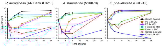 Bug–drug duos flagged as synergistic in the checkerboard assays were further evaluated in time-killing experiments to confirm synergistic bacterial killing. Representative time-killing plots of select pathogens are displayed in Figure 1 and serve as a visual aid to conceptualize the rate and extent of bacterial killing observed during time-killing experiments. The entirety of the time-killing data is comprehensively listed in Table 2 and includes every organism that was evaluated in the time-killing experiments. All of the organisms investigated in the time-killing experiments grew more than 2 log10 CFU/mL between 0 and 24 h in the absence of drugs, indicating that none of the isolates possessed growth defective phenotypes. The complete set of growth control data is available in Table A1.