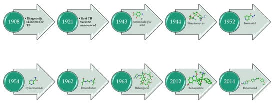 Following the successful isolation of the causative agent of tuberculosis (TB) Mycobacterium tuberculosis (Mtb) in 1882 [1], the development of TB diagnosis in 1908, the first vaccination in 1920–21 [2], the first anti-TB drugs p-aminosalicylic acid [3] and streptomycin [4] in the 1940s (Figure 1), followed by the discovery of the first-line anti-TB drugs isoniazid (INH) [5], pyrazinamide (PZA) [6], ethambutol [7], and rifampicin [8], and the more recently developed bedaquiline (BDQ) [9] and delamanid [10], TB continues to be a leading infectious disease with a global estimate of 1.13 million deaths annually among HIV-negative people [1]. Unfortunately, the global incidence of TB has recently resurged to levels not seen since 2019, with an estimate of about 10.6 million new infections [11]. Global efforts to end TB by 2025 have only shown a marginal 19% net reduction from 2015–2022 and are far off from the 2025 milestone for reducing TB infections to less than 0.6 million [11]. Mtb infections are spread by tuberculoid bacilli-infested aerosol during coughing or liquid droplets from the runny nose of infected patients [12]. The incidence of multidrug-resistant TB (MDR-TB) that lacks sensitivity to first-line therapeutic drugs such as INH, Rifampicin (R), or PZA [11]. Further, the emergence of extremely drug-resistant strains that contribute to latent TB infections makes it exceedingly difficult to control and treat TB [11].