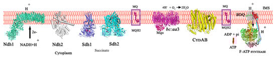 Mtb is able to re-route its metabolic respiration depending on the presence or absence of oxygen and nutrients and maintains a very basal level of respiration. This enables the pathogen to switch into a dormant phase, thereby surviving the adverse growth conditions prevailing in phagosomes or granulomas and sustaining its life until such time as favorable growing conditions are encountered [13,14]. Such dynamic adaptation to adverse growing conditions achieved by lowering the consumption of the main energy fuel, adenosine triphosphate (ATP), and maintaining ATP/ADP homeostasis is conferred by the oxidative phosphorylation (OXPHOS) pathway, including the enzymes of the electron transport chain (ETC) and the final catalyst, the F1FO-ATP synthase (Figure 2) [15]. The NADH dehydrogenase (NDH-1 and/or NDH-2), the succinate dehydrogenase (Sdh-1 or Sdh-2) and the malate/quione oxidoreductase (Mqo) help in recycling the central metabolic electron carrier NADH and the oxidation of the Krebs cycle substrates succinate and malate, respectively, to transfer electrons to the menaquinone (MQ) pool [16,17,18]. The cytochrome bcc/aa3 oxidase supercomplex and the cytochrome bd oxidase accept electrons from menaquinol and efficiently reduce oxygen to water [19,20,21]. While electrons are transferred along the ETC, protons are translocated from the cytoplasm to the intermembrane space to generate the proton motive force (pmf). These protons are transported back to the cytoplasm by the membrane-embedded FO-domain of the F1FO-ATP synthase, providing the necessary torque to induce ATP synthesis in the F1-domain of this engine [22].