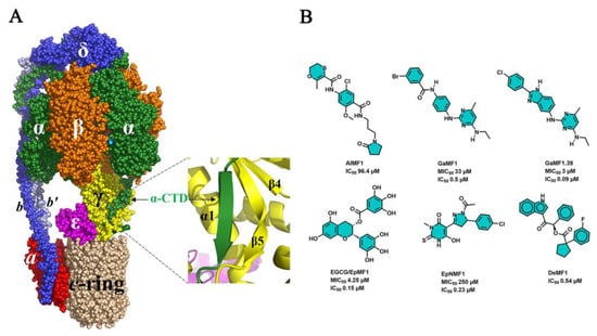 - Harikishore, A.; Wong, C.F.; Ragunathan, P.; Litty, D.; Müller, V.; Grüber, G. Targeting Mycobacterial F-ATP Synthase C-Terminal alpha Subunit Interaction Motif on Rotary Subunit gamma. Antibiotics 2021, 10, 1456. [Google Scholar] [CrossRef] [PubMed]