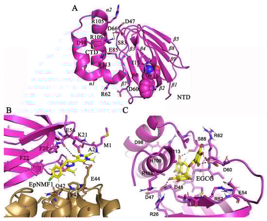Mtb ε structure, highlighting the important interaction sites. (A) Highlighted are the polar interactions between the N-terminal domain (NTD) and CTD. The W16 residue (shown in spheres, pdb: 5yio [30]), whose mutation induces hypersusceptibility to BDQ, is highlighted. (B) EpNMF1 interaction with ε’s N-terminal residues K21, F20, F22, A2. (C) Binding interactions of EGCG at the C-terminal α2-helix and polar contacts with D48, D60, S88 with hydroxy groups of EGCG.