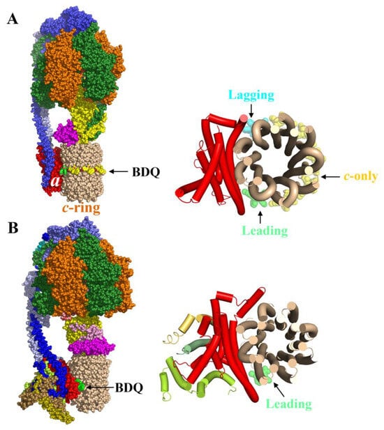 BDQ-bound Mtb- and human F-ATP synthase cryo-EM structure. (A) Side view of Mtb F-ATP synthase structure (PDB ID: 8j0S) [26]. Shown on right-hand side is the top view of a-c9-ring domain, highlighting one BDQ at the leading and lagging site of a-c9-ring interface, respectively. While five BDQ molecules were also seen at the c-only binding sites. (B) Human mitochondrial F-ATP synthase structure (PDB ID: 8ki3 [26]). The top view of the FO-domain, presented on the right-hand side, shows only one BDQ bound to the leading site.