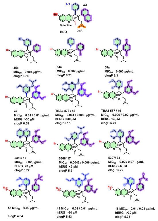 Initial attempts to lower the lipophilicity of BDQ derivatives by varying the ‘Br’ at the sixth position on BDQ’s quinoline ring with –S-CH3, -SO2-CH3, -SO2-(CH2)2-NH2, -O-(CH2)2-NH2, -NH-(CH2)2-NH2, CH=CH2, and cyanide (CN) groups have shown a reduction in MIC90 by more than 10-fold. Only the replacement of bromine with chlorine was tolerated, and it maintained an MIC90 activity comparable to BDQ [50,51]. These findings reveal that the Br- or Cl group on position six of quinoline and DMA (highlighted in red) are strictly required to maintain the MIC (Figure 6). Among the variations on the phenyl group (Ar1), only the 3-Cl group (45a) yielded an MIC90 of 0.004 µg/mL on M. smegmatis cultures (Figure 6) while replacing the naphthyl group with o-fluorophenyl (54a) or 2,5-difluorophenyl (58a) caused good potency (MIC90 of 0.007 and 0.003 µg/mL, respectively) [50,51], suggesting the tolerance for monocyclic aromatic rings.