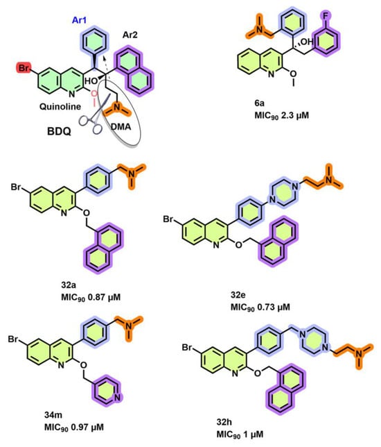 He et al. [62] attempted to simplify the chemical synthesis of BDQ by (i) removing chirality by re-arranging the DMA moiety (orange-colored atoms) on either of the Ar1/Ar2 ring substitutions (blue/violet-colored rings, respectively, Figure 7), (ii) removing the bromine/hydroxyl atoms, and (iii) modifying the Ar2 ring substitution onto the 2-OMe group and DMA moiety to Ar1 group. In one series, the DMA moiety is incorporated into the Ar1-ring, an m-fluoro-benzyl group is used as the Ar2-group, and the 6-bromine group is omitted to yield molecule 6a (Figure 7) with an MIC90 of 2.3 µM [62]. In another series, the best MIC90 active molecules were obtained from a series replacing the Ar2-ring with the 2-OMe group and the DMA onto the Ar1-group. Ligands 32a, 32e, 32m, and 32h (Figure 7) inhibited the Mtb H37Rv cultures with an MIC90 of 0.87, 0.73, 0.97, and 1 µM, respectively. Not surprisingly, with the removal of core pharmacophore features—chiral centers—aryl Ar1/Ar2 and the hydroxyl groups of BDQ, the compound 32a, 32e, 32m, and 32h showed reduced inhibition of ATP synthesis (IC50 of 20–40 µM). Furthermore, analogs 34m and 34e also maintained similar inhibition of growth with a two-fold increase in MIC90 potency towards drug-resistant clinical strains 12153, 6133 [62].