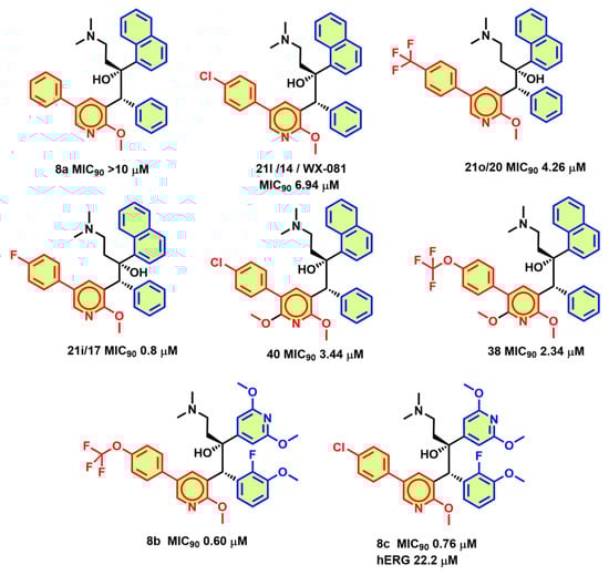 Barbaro et al. have further explored similar substitutions on the 5-phenyl-2-methoxy-pyridine ring in the BDQ and TBAJ-587 scaffold [65]. 4-Cl (8c), 4-F (17), and 4-CN (8l) substitutions on the 5-phenyl-2-methoxy-pryidine ring of TBAJ-587 afforded more potent MIC90 of 1.9, 4.3, and 6.0 μM, respectively, in comparison to the quinoline ring of BDQ (8a, 14, 17, 20, 38, and 40 Figure 8). Characterization of the diastereomeric pairs demonstrated that RR and SS had only µM MIC90 potency, while RR, SS diastereomers of 4-OCF3 (8b), 4-Cl (8c) (Figure 8), 4-CN (8l) substituted 5-phenyl-2-methoxy-pryidene had an MIC90 of 1.09, 1.45, and 2.25 μM, respectively. Furthermore, separation of the enantiomers highlighted that only S,S enantiomers of 4-OCF3, 4-Cl, 4-CN derivatives had sub-µM potency on Mtb H37Rv cultures with an MIC90 of 0.60, 0.76, 0.98 μM, respectively. Among the 4-OCF3 (8b) and 4-Cl (8c) derivatives (Figure 8), the 4-chlorophenyl pyridyl derivative (8c) not only showed lesser affinity towards the hERG channel with an IC50 of 22 μM but also retained MIC90 potency. [65].