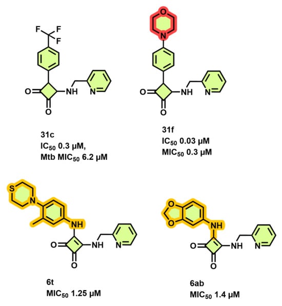 Tantry et al. [66] reported a novel scaffold squaramide (31c, Figure 9) that binds to a subunit a-c interface, which is different from that bound by BDQ and inhibits ATP synthesis with an IC50 of 0.3 µM and Mtb growth with a MIC50 of 6.2 µM [66]. Selection for spontaneous resistance (31f, (Figure 9)) yielded the two mutants, K179N on subunit a and D28N on subunit c, confirming the involvement of an a-c interface. SAR results revealed that the morpholine ring (Figure 9, shown in magenta) at position 4 of the phenyl moiety yielded the best IC50 (0.03 µM) and MIC50 (0.3 µM) values when compared with the parent compound (31c, Figure 9). However, smaller substitutions, such as a CN group on the phenyl moiety, eroded the inhibitory effects compared with CF3 substitution. Substitutions on the “amino-methyl-2-pyridine” moiety revealed that the 2-aza atom on the pyridyl moiety was essential for activity. Varying the pyridine moiety with pyrazine or phenyl showed a decreased and total loss of activity, respectively. Extending the substitution at methyl atoms of amino-methyl-2-pyridine or the aryl character at position 5 of the pyridine did not improve the activity profile in comparison to the parent compound [66]. Another study demonstrated that diamino-substituted cyclobut-3-ene-1,2-dione derivatives 6t, 6ab (MIC50 1.25 and 1.4 µM, respectively, Figure 9) were also able to maintain their anti-TB potency on H37Rv Mtb cultures as well as multi-drug resistant (MDR)–13946, 14862 TB strains [67].