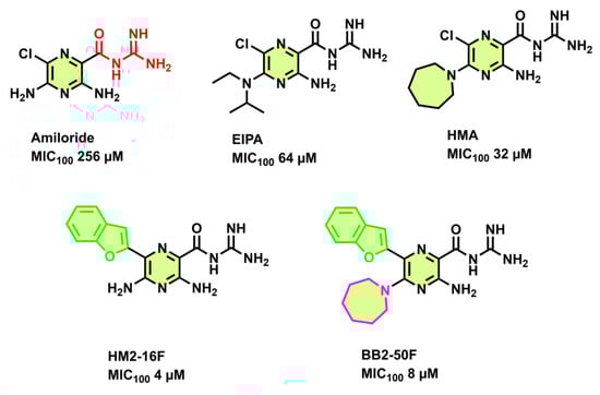 Based on bioisosterism to BDQ, amiloride, 5-(N, N-hexamethylene)-amiloride (HMA), and EIPA (5-(N-ethyl, N-isopropyl)-hexamethylene amiloride) (Figure 10) were able to inhibit the growth of Mtb H37Rv with a weak potency of 256 µM, 32 µM, 64 µM, respectively [68]. Amiloride derivatives also inhibited ATP synthesis in M. smegmatis IMVs. HM2-16F, a derivative of the FDA-approved drug amiloride, inhibits Mtb H37Rv cultures as well as BDQ-resistant mutants. HM2-16F (Figure 10) binds weakly to the Mycobacterium phlei F-ATP synthase c-subunit [68] and displayed moderate bactericidal activity (MIC100 4 µM) towards Mtb cultures. Interestingly, HM2-16F lacked cross-resistance to F-ATP synthase c subunit A63P mutation or to Rv0678 (MMP5-MMPl5 efflux pump). The compound was described as a dual inhibitor, working in concert with a mycobacterial cytochrome bd oxidase inhibitor [68].