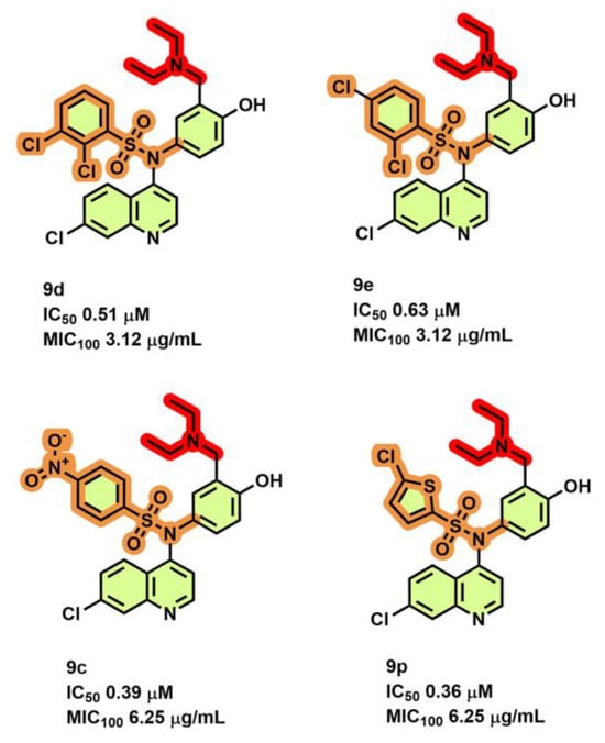 Singh et al. [73] performed a structure-guided lead optimization approach on their hit molecule—amodiaquine—and derivatized four ligands 9c, 9d, 9e, and 9p (Figure 13). The analogs of these four ligands showed sub-µM potency with an IC50 of 0.39, 0.51, 0.63, and 0.36 µM in ATP synthesis inhibition in M. smegmatis IMVs. Among this series, analogs 9d and 9e were the most potent in Mtb H37Rv growth inhibition (MIC100 = 3.12 µg/mL) when compared to analogs 9c and 9p (MIC100 at 6.25 µg/mL). Interestingly, 9d showed a higher selectivity index of >96-fold towards Mtb over Vero cells, bactericidal activity on hypoxic cultures at 100 µg/mL (2.3 log10 CFU/mL), and a low clearance rate of 0.06 L/h/kg. In vivo mycobacterial efficacy determined using a chronic mouse infection model suggested that 9d at a dose of 173 µmol/kg conferred a survival of 60%, while the smaller dose could protect only 40% of the mice tested. In comparison, there was a 90% survival of mice with INH (182 µmol/kg). A reduction in bacterial load of 2.12 log10 CFU/mL and 1 log10 CFU/mL was seen in lung and spleen tissues for high and low doses used, respectively [73].