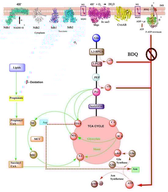 Interestingly, the works of Mackenzie et al. highlighted the possibility of combination therapies that can target both OXPHOS and glycolysis [74] and confer rapid killing of Mtb. To compensate for the loss of ATP by BDQ treatment, Mtb induces pleiotropic effects on its central metabolism by enhancing respiration through the glyoxylate shunt pathway/β-oxidation of fatty acids via the methyl citrate cycle (MCC), thereby generating substrates for the TCA cycle [74]. With declining ATP levels due to BDQ treatment, a few cycles of this pathway would consume the depleting basal ATP and eventually implode into a collateral loss of glutamine synthetases [75] needed for regenerating substrates of the TCA cycle (Figure 14), thereby pushing Mtb to a metabolically lethal state [74].