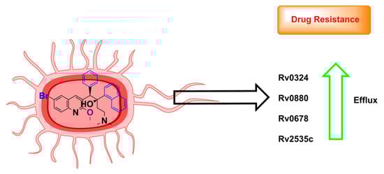 Non-target-based mutations in Rv0678 putatively increase BDQ/CFZ efflux through the MmpS5-MmpL5 pump [78,79]. Mutations in the transcriptional regulator Rv0678 (mmpS5) elevated the expression levels of MMPL5 and enhanced efflux activity (Figure 15). Similarly, loss-of-function mutations in pepQ (Rv2535c), encoding a Xaa-Pro aminopeptidase [80], displayed a loss of MIC sensitivity to BDQ in comparison with the WT H37Rv strain [80]. Though the underlying mechanism for pepQ mutation is yet to be clarified, overexpression of pepQ renders susceptibility to BDQ. Co-incubation with efflux inhibitors such as verapamil or reserpine (Table 1) [81] demonstrated additive actions, leading to enhanced killing of mycobacteria in both WT and mutant cultures. However, verapamil did not elicit similar synergy regarding bactericidal activity, nor did it avert the efflux pumps when tested in vivo in mice [81]. Nevertheless, from a mechanistic point of view, these studies highlight the utility of MmpL5 or pepQ inhibitors in combination with BDQ as an attractive strategy to delay the emergence of BDQ resistance [80,82].