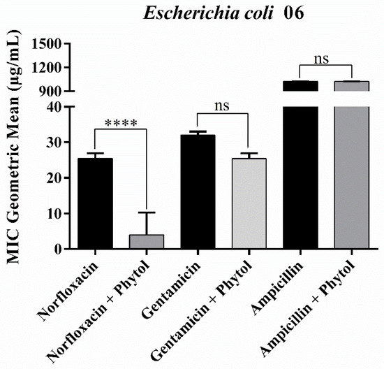 Minimum Inhibitory Concentration (MIC) of phytol in combination with antibiotics against the multidrug-resistant Escherichia coli 06 strain. ns: not significant (p > 0.05), ****: p < 0.0001. Bars represent the standard deviation of the geometric mean of MIC (n = 3).