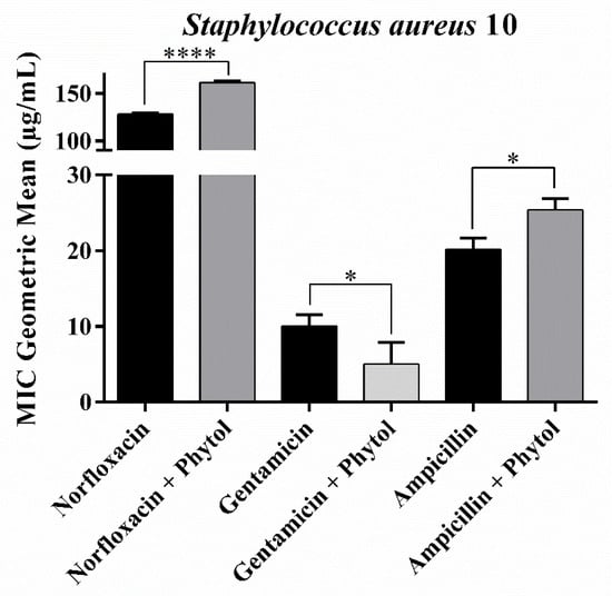 Minimum Inhibitory Concentration (MIC) of phytol in combination with antibiotics against the multidrug-resistant Staphylococcus aureus 10 strain. *: p < 0.01, ****: p < 0.0001. Bars represent the standard deviation of the geometric mean of MIC (n = 3).