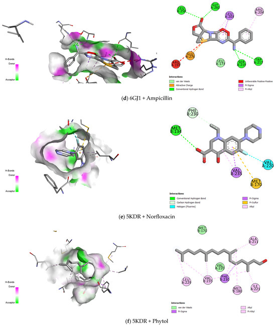 Description of the active sites and drug–receptor interactions between drugs (norfloxacin, phytol, gentamicin, and ampicillin) and proteins (5KDR and 6GJ1).