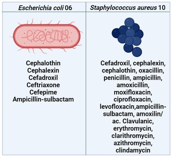 Resistance profile of Escherichia coli 06 and Staphylococcus aureus 10. Source: Laboratory of Microbiology and Molecular Biology (LMBM), Regional University of Cariri (URCA).