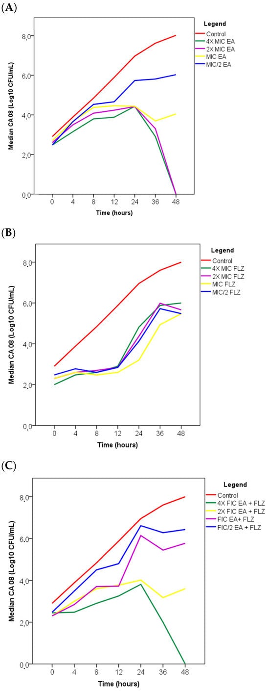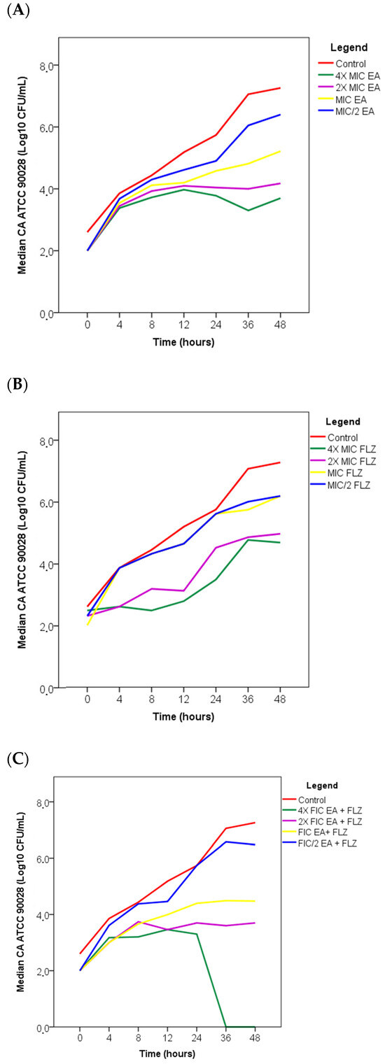 Time-kill curve of C. albicans ATCC 90028 under the action of EA (A) and FLZ (B) and their combination (FIC EA + FLZ) (C) showing the medians. The Shapiro–Wilk test was used to assess the normality of the sample. Significant differences between groups were determined by Kruskal–Wallis analysis followed by Dunn’s test with p > 0.05 considered significant. Legend: FIC = fractional inhibitory combination, MIC = minimal inhibitory concentration, EA = ellagic acid, FLZ = fluconazole.