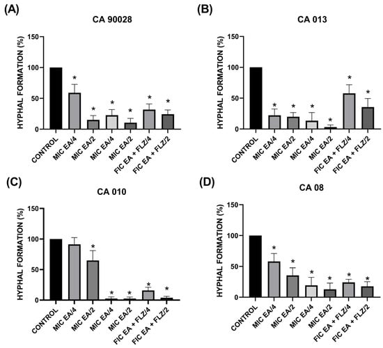 C. albicans hyphae formation. Clinical isolates: (A) CA 90028; (B) CA 013; (C) CA 010; (D) CA08. The Shapiro–Wilk normality test was applied. The results are presented as mean and standard deviation; significant differences between groups were determined by one-way analysis of variance (ANOVA) followed by Tukey’s multiple comparison where the value of p < 0.05 (*) was considered significant.