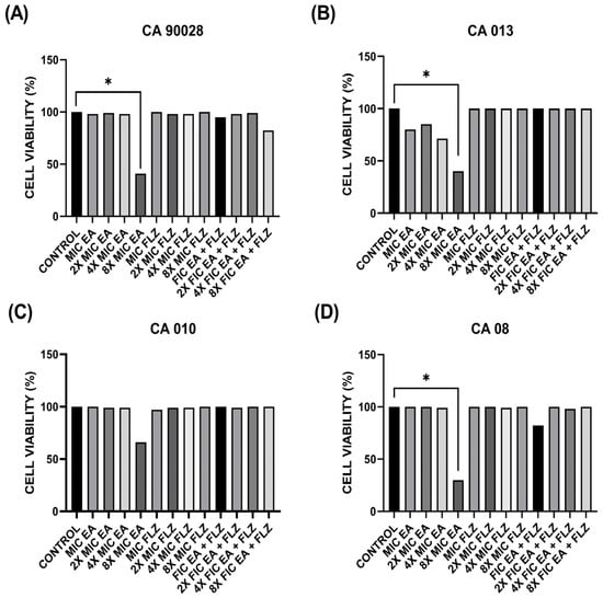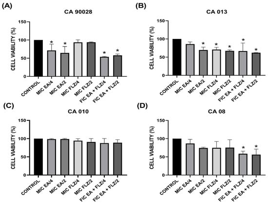 Cell viability of young C. albicans biofilms. Clinical isolates: (A) CA 90028; (B) CA 013; (C) CA 010; (D) CA08. The Shapiro–Wilk normality test was applied. Results are presented as mean and standard deviation; significant differences between groups were determined by one-way analysis of variance (ANOVA) followed by Tukey’s multiple comparison where the value of p < 0.05 (*) was significant.