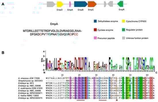 The precursor peptide gene empA encodes a 59-residue peptide consisting of a 33-residue leader peptide followed by a predicted 26-residue core peptide. This core region contains three serines, two threonines, and four cysteines, which may allow the formation of a four-ring cyclized peptide. Moreover, the presence of the LDLD motif in the leader peptide suggests that embleporicin likely belongs to the class I lanthipeptide group [37,41].