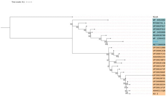 The SCO0268 sequences were obtained and downloaded from the Uniprot database [94]. Alignments were performed using the T-Coffee server [95], and these alignments were subsequently filtered with PhyML 3.0 [96] to reconstruct the phylogenetic tree using the Maximum Likelihood method based on the LG substitution model. A bootstrap analysis with 1000 resamplings was conducted. The phylogenetic tree was visualized and modified using the Interactive Tree Of Life v7 (iTOL) [97], with the NisA sequence as the outgroup.