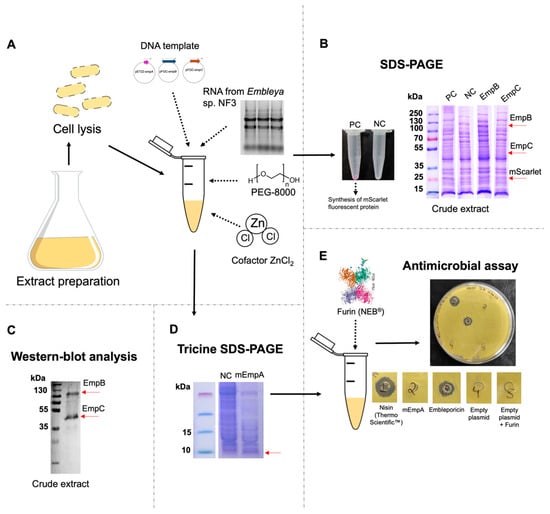 Reconstitution of embleporicin biosynthesis using the CFPS system. (A) Extract preparation and addition of other extract components for the synthesis of embleporicin. (B) SDS-PAGE electrophoresis of the crude extract to visualize the post-translational modifying enzymes (EmpB and EmpC). The red arrows indicate the expected size of the enzymes; PC means positive control, and NC means negative control. (C) Western-blot analysis of the post-translational modifying enzymes (EmpB and EmpC). (D) Tricine SDS-PAGE to visualize the modified peptide (mEmpA). The red arrow indicates the expected size of the mEmpA, and NC means negative control. (E) Addition of Furin to the in vitro reaction and an antimicrobial assay of the modified peptide (mEmpA) and the mature peptide (embleporicin). Nisin (Thermo Scientific, Waltham, MA, USA) was used as a positive control, and empty plasmids with and without the addition of Furin were used as negative controls.