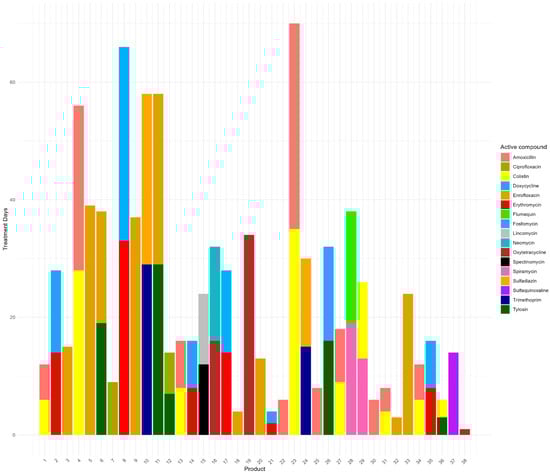 The total number of treatment days per antimicrobial product that was used in the study farms (across 78 production cycles). The product names have been recoded into numbers and are labeled alphabetically.