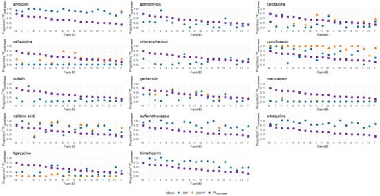 The susceptibility profiles of 25 E. coli isolates per farm were assessed using Sensititre Minimum Inhibitory Concentration EUVSEC plates (Thermo Fisher Scientific, Landsmeer, the Netherlands) [48]. This was carried out for a panel of 14 antimicrobials: sulfamethoxazole, trimethoprim, ciprofloxacin, tetracycline, meropenem, azithromycin, nalidixic acid, cefotaxime, chloramphenicol, tigecycline, ceftazidime, colistin, ampicillin, and gentamicin (Supplementary File S3).