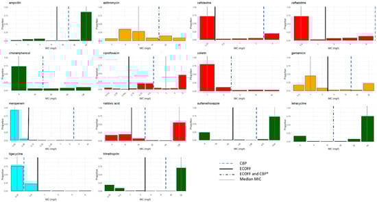The MIC distribution of isolates across 14 different antimicrobials. The bars are color-coded according to the WHO classifications of antimicrobial importance: the red bars represent HPCIAs, the orange bars denote CIAs, and the green bars signify HIAs. The turquoise bars denote antimicrobials that are categorized as being for human use only. * For azithromycin, chloramphenicol, colistin, and tetracycline, the ECOFF and CBP lines align because the ECOFF breakpoint defines values greater than (>) as indicating NWT, while the CBP breakpoint uses values greater than or equal to (≥) to indicate resistance.