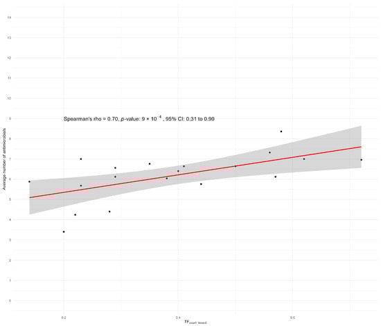 An analysis of the relationship between AMU and AMR per farm was performed at the clustered and non-clustered levels. A clustered analysis using the Spearman correlation coefficient was performed to examine the relationship between the average AMU (averaged for all antimicrobial classes per cycle per farm, expressed as TFcount-based) and the average number of tested antimicrobials (n = 14) to which E. coli isolates from the same farm showed an NWT phenotype (i.e., MIC > ECOFF).