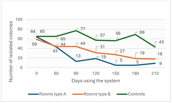 A total of 1631 (bacterial and fungal) colonies were isolated from air samples during the testing of the basal contamination level from all three-room types. The number of colonies isolated from air samples in relation to the usage of the system was consequently tested 30 days (first test), 90 days (second test), and 180 days (third test) after the basal contamination level test. In room type A, 439 colonies were isolated in the first test, 208 colonies were isolated during the second test, and 27 colonies were isolated during the third test (Figure 1). In room type B, 488 colonies were isolated during the first test, 320 colonies were isolated during the second test, and 200 colonies were isolated during the third test. In control rooms, the number of isolated colonies stayed steadily over 540 (namely, 570, 559, and 565) during each subsequent test (Figure 1).