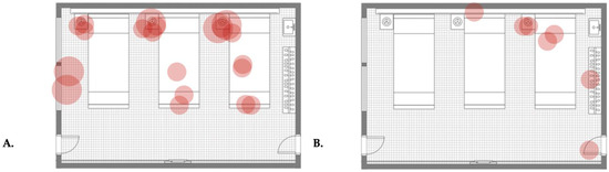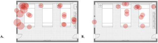 Map plot of the qualitative colony isolation from the first (A) and last (B) surface sampling of a room type A. Each figure presents a ward room where three patients’ beds (bed number 1: right, bed number 2: in the middle, and bed number 3: left), patients’ closets with hangers, sinks (both on the right), bed tables (on the left side of each bed), bed lamps and monitors (on top of each bed), two windows (on the left), the entrance door (right bottom), and the balcony door (left bottom) are distinguishable. Each red circle demonstrates an isolation. Small circles represent minor cultural growth, moderate circles represent moderately massive cultural growth, and large circles represent massive cultural growth for each isolation. Labelling of room furniture and a guide for identifying indicators of cultural growth are presented in detail in Figure S1.