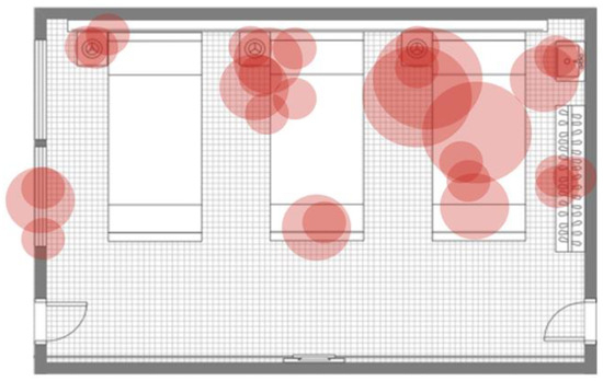 Map plot of the qualitative colony isolation from the first surface sampling of the control room. Each figure presents a ward room where three patients’ beds (bed number 1: right, bed number 2: in the middle, and bed number 3: left), patients’ closets with hangers, sinks (both on the right), bed tables (on the left side of each bed), bed lamps and monitors (on top of each bed), two windows (on the left), the entrance door (right bottom), and the balcony door (left bottom) are distinguishable. Each red circle demonstrates an isolation. Small circles represent minor cultural growth, moderate circles represent moderately massive cultural growth, and large circles represent massive cultural growth for each isolation. Labelling of room furniture and a guide for identifying indicators of cultural growth are presented in detail in Figure S1.