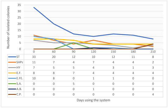 For this evaluation, we recorded data on all isolated samples, including the names of bacteria and types of microorganisms (fungi or bacteria), across the timespan of surface samplings from each room type. By organizing the data on isolation frequencies, we identified the most frequently occurring and sporadically appearing organisms in each room. Unsurprisingly, the most commonly isolated microorganisms were coagulase-negative Staphylococcus species (CoNS), followed by aerial saprophytes (SAPs), hyphae (HY), Enterococcus faecium, and Enterococcus faecalis (Figure 6). In contrast, Acinetobacter baumannii, Staphylococcus aureus, and Clostridium perfringens appeared only sporadically. By plotting the data collected on the number of isolations across seven environmental samplings (from rooms where the system was used), we evaluated the trends in isolation counts to determine whether there was a significant decrease in the presence of various microorganisms over time (Figure 6). To evaluate trends over time, we applied Kendall’s Tau correlation analysis, a non-parametric statistical test that is particularly suited for detecting monotonic trends without assuming a specific data distribution. Given the small sample size and potential nonlinear patterns in the isolation counts, Kendall’s Tau was chosen over linear regression, as it provides a robust approach for analysing data with limited points and varying patterns without forcing a linear fit.