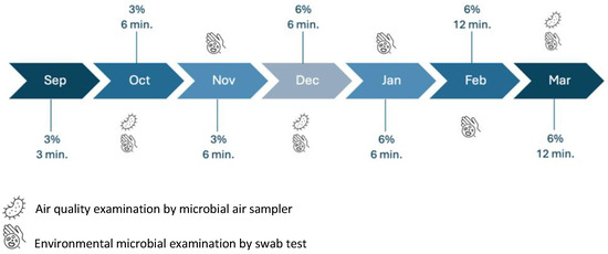 Although the gradual increase in DCs and primary exposure times was based on the results of the system’s efficacy, the maximum possible DC was determined at the beginning of the study based on the increase in the humidity level in the rooms in relation to the use of the system. This change in the humidity level could not exceed the threshold of 60%. Based on the size of the rooms in our department, 12 min was considered the maximum exposure time that could be planned (if needed) to reach the maximum efficacy (Figure 7).