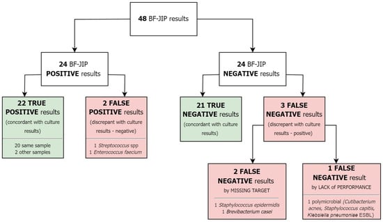 In particular, 22 TP, 21 TN, 2 FP, and 3 FN were identified. Two FN were due to pathogens not covered by the panel but identified by traditional culture (Staphylococcus epidermidis and Brevibacterium casei). The remaining FN was due to the BF-JIP’s lack of performance. Among TP cases, two showed a match between BF-JIP results and cultures from alternative specimens. We reported two FPs: one in a patient without a final diagnosis of infection and the other in a patient with an infection caused by a pathogen not detected by the BF-JIP.